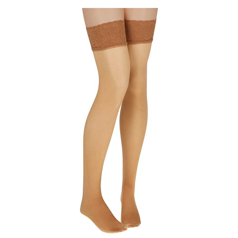 Deze stay up houden zich op met een kante silicone plakband. Ze geven uw benen een mooiere vorm door de mooie satijnglans. De silicone boord zorgt voor een goede draagcomfort.