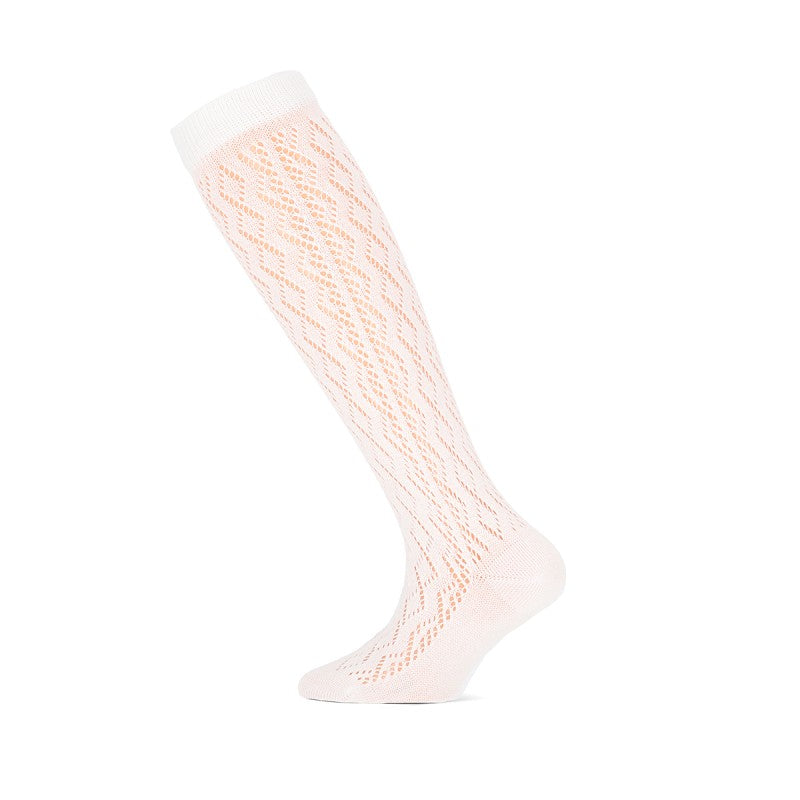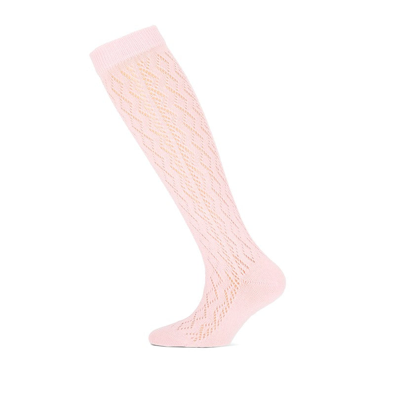 Deze effe gekleurde sokken komen juist onder de knie.  Zijn voorzien met een ajour motief, wat deze juist een iets meer gekledere look geeft, ideaal voor feestenlijkere gelegenheden.